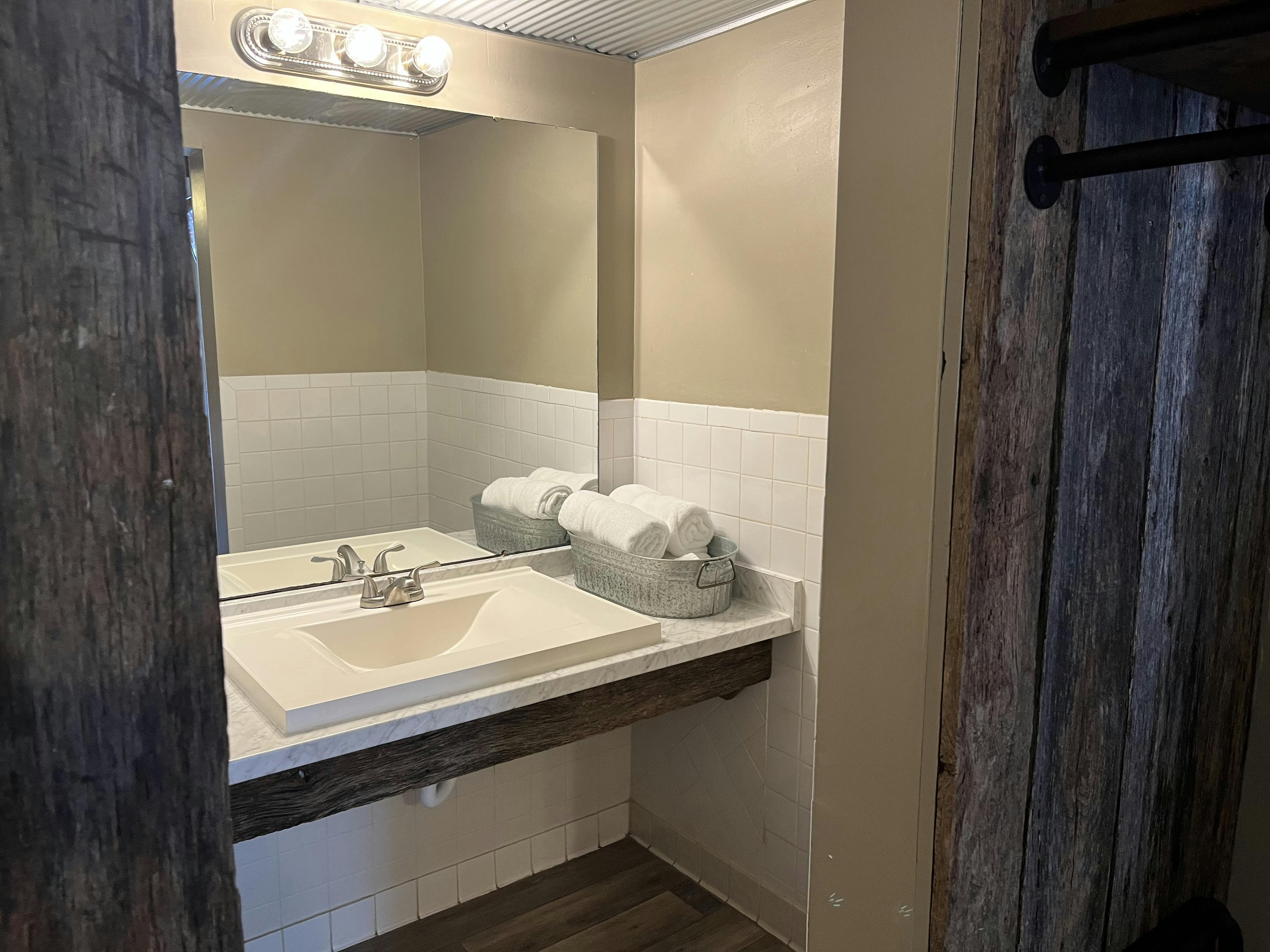 Relax in the rustic guest room with 1 king size bed. Comfy Serta mattress, nice crisp sheets and clean blankets. This room offers a Table with 2 stools, mini refrigerator, microwave, coffee maker, full bath, large vanity area, single chair, 32-inch flat screen TV, Wifi, and Amenities. Refresh in this rustic guest room with the genuine barn wood and old metal. Each room is uniquely decorated and even changes with the seasons and holidays.